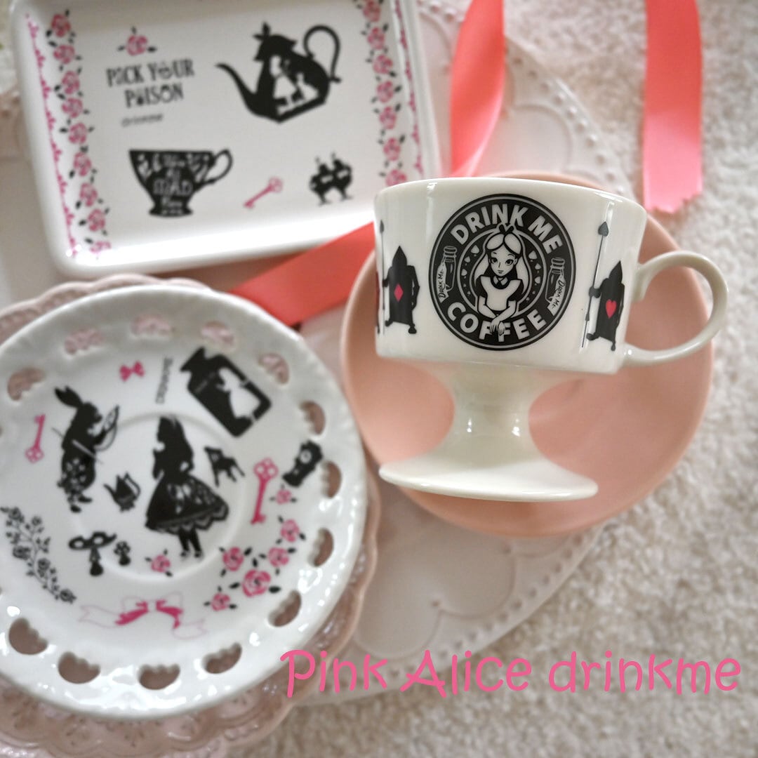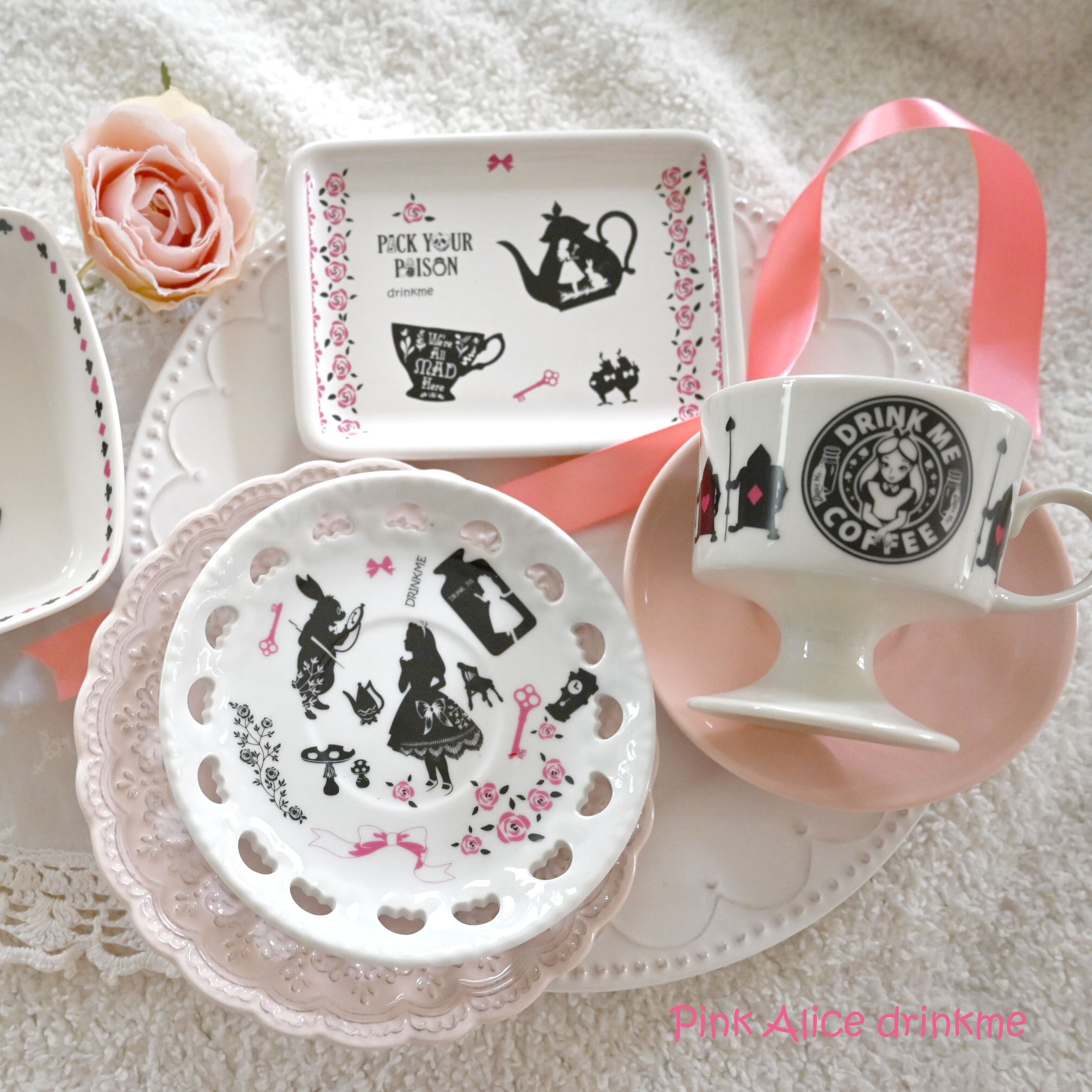 モチーフ:アリス・ティーカップ・ティーポット・ドリンクミー・時計・鍵・白ウサギ・女の子・ハート・ダイヤ・スペード・ローズ(薔薇・バラ)・クローバー・王冠・チェシャ猫・ウサギ・ドードー・トランプ兵・ワイングラス・drinkmecoffee・リボン