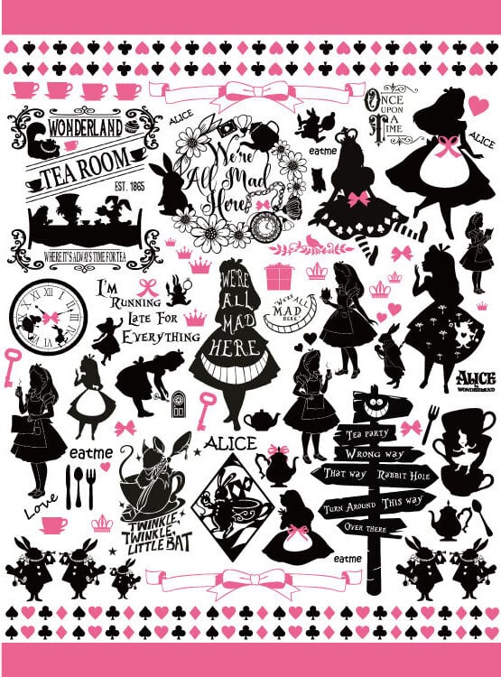 モチーフ:アリス・ティーカップ・ティーポット・ドリンクミー・時計・鍵・白ウサギ・女の子・ハート・ダイヤ・スペード・クローバー・王冠・チェシャ猫・ウサギ・ドードー・ワイングラス・・フォーク・ナイフ・スプーン・リボン