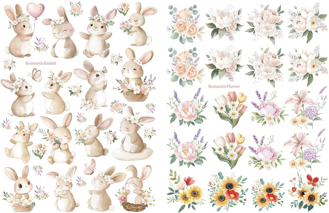 【set割引】2枚セット 水彩ロマンティックラビット&フラワー転写紙 (ポーセリンアート・うさぎ・花転写紙)