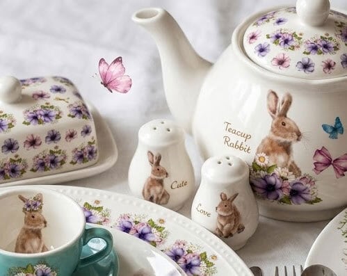 ウサギと、お花、ティーカップ、リボン・・